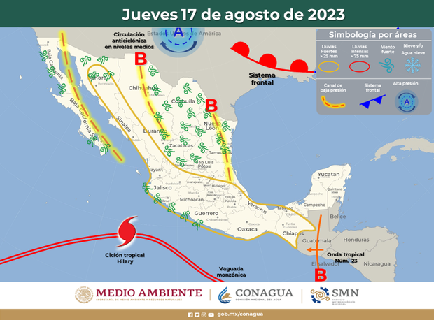 Para este jueves, el monzón mexicano sobre el noroeste de México en interacción con divergencia en altura, circulación anticiclónica en niveles medios de la atmósfera y un canal de baja presión, favorecerán ambiente de templado a cálido por la mañana, de caluroso a muy caluroso por la tarde, temperaturas frescas en la zona serrana, cielo de despejado a parcialmente nublado, vientos de 5 a 20 km/h, con rachas que pueden superar los 55 km/h en parte de la zona sureste, incluye: Jiménez.
