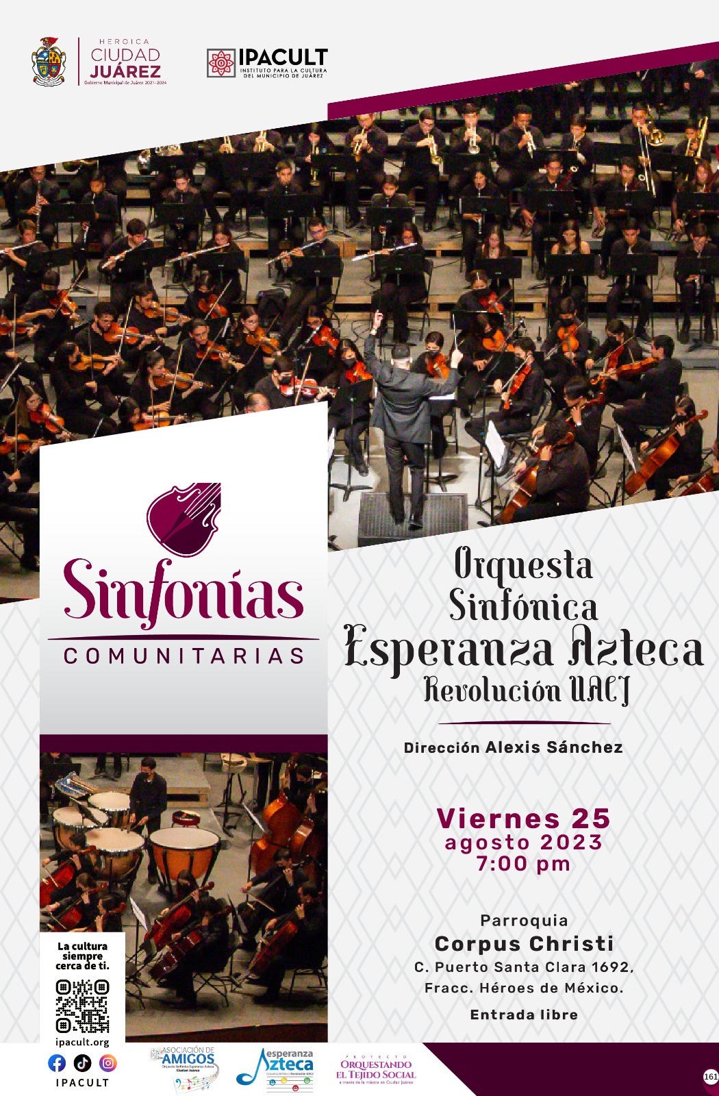 Después de un receso, vuelven las Sinfonías Comunitarias, evento que se realiza con la finalidad de llevar la música a diferentes zonas de la ciudad. Esta vez toca el turno en la parroquia Corpus Christi, ubicada en la calle Puerto Santa Clara número 1592, en la colonia Héroes de México, en el suroriente.