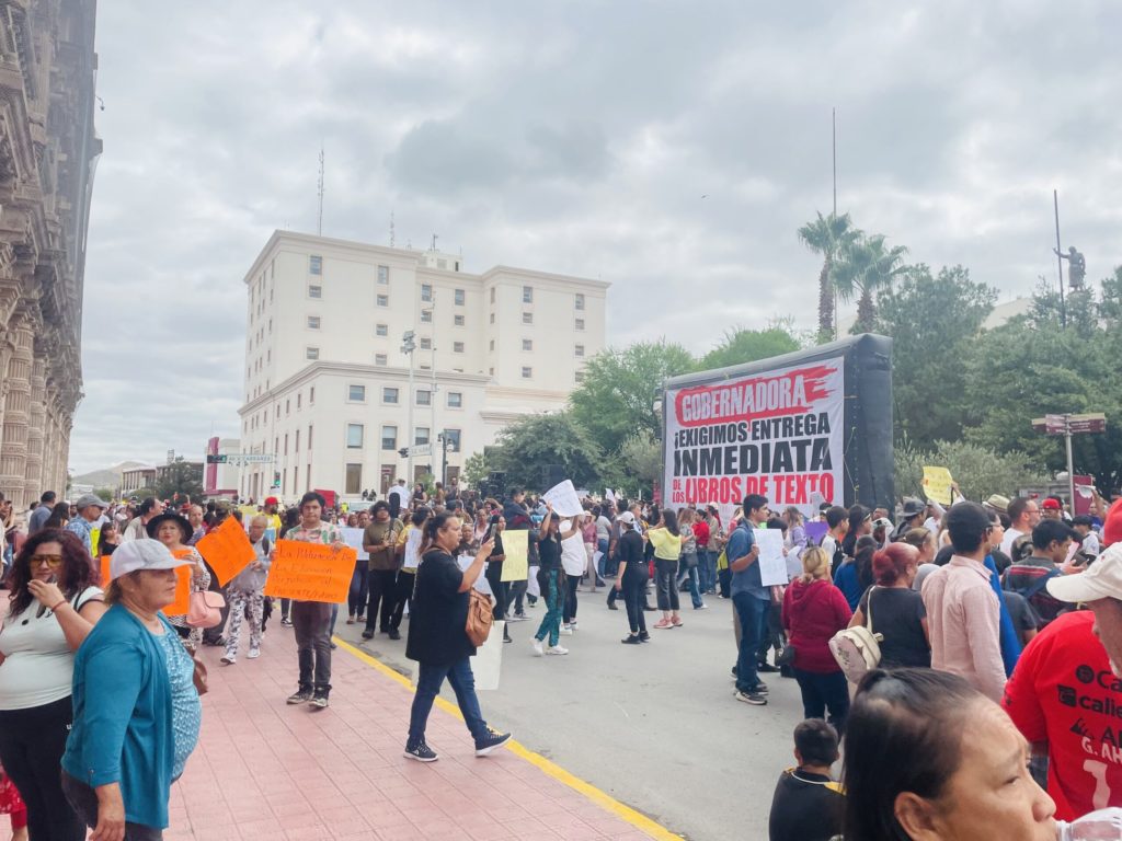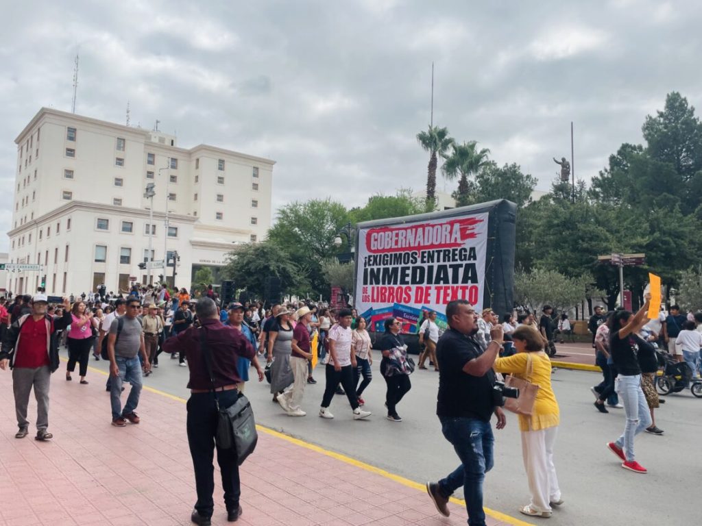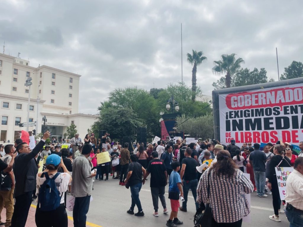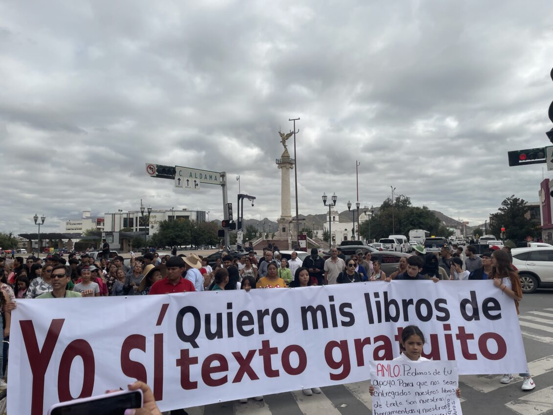 Ahí, sobre la calle Aldama, fue instalado un templete para protestar y exigirle a la gobernadora la entrega de los nuevos libros de texto.
