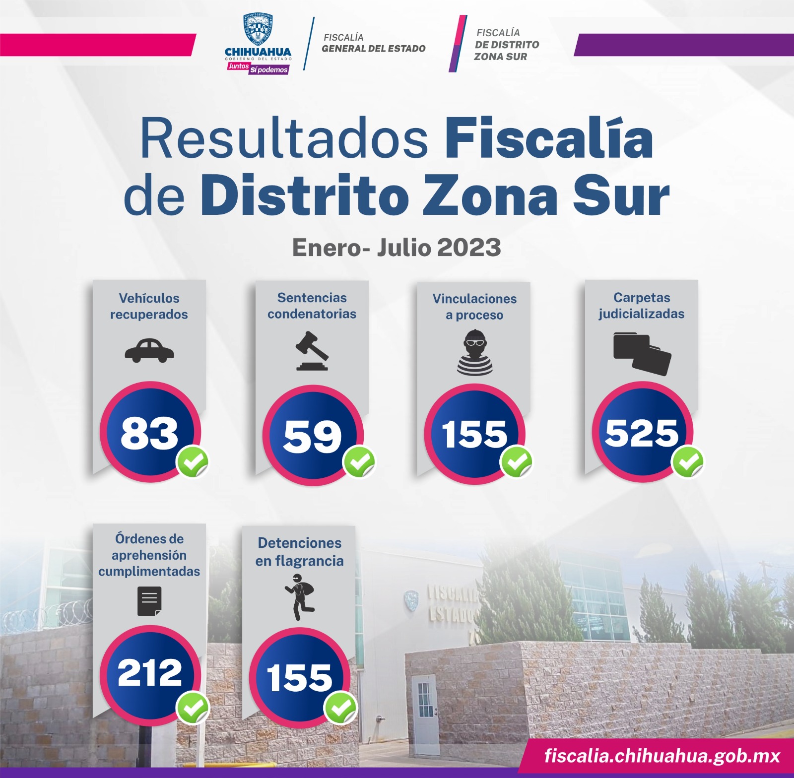 En ese periodo, a través del Ministerio Público se obtuvieron 59 sentencias condenatorias en contra de personas que cometieron un hecho delictivo y se logró que los imputados en 155 causas penales, quedaran vinculados a proceso, además de judicializarse 525 carpetas de investigación.
