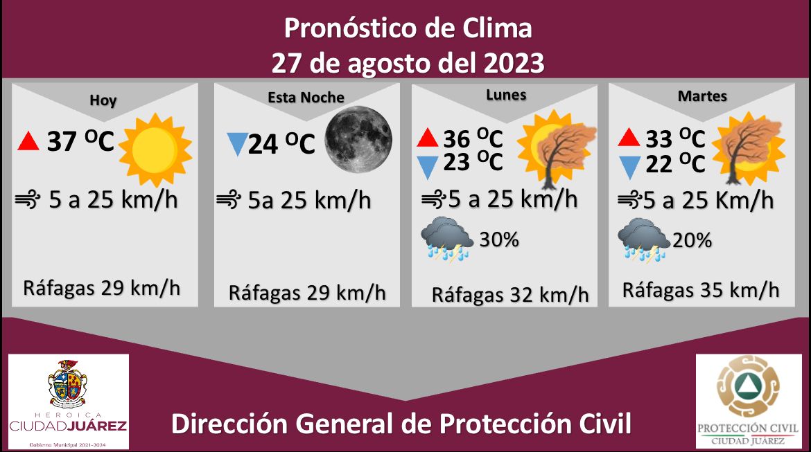 Para mañana lunes se esperan fuertes ráfagas de viento que alcanzarán los 32 kilómetros por hora, existe una probabilidad de lluvia de un 30 por ciento, la temperatura máxima se pronostica en los 36 °C, mientras que la mínima será de 23 °C, la velocidad del viento oscilará de 5 a 25 kilómetros por hora.