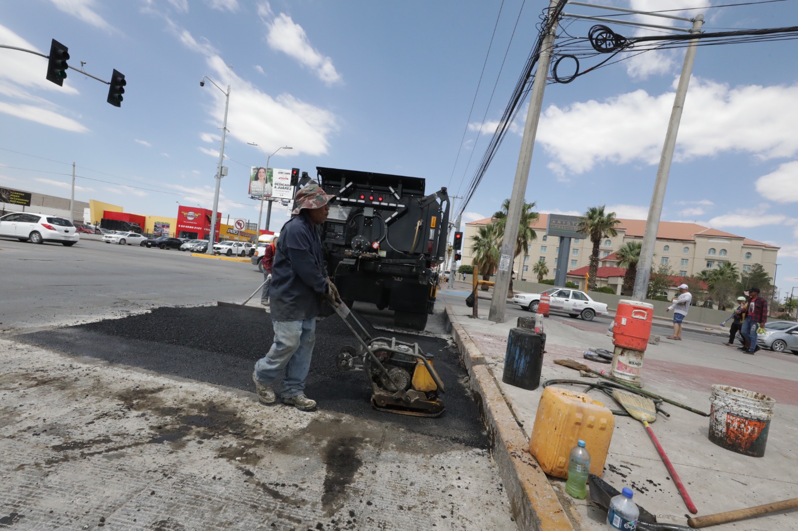 Personal de la Dirección General de Obras Públicas inició los trabajos de reparación de losas en la intersección de la avenida Tecnológico y la Teófilo Borunda, a fin de mejorar las condiciones de movilidad y brindar seguridad a los miles de guiadores que diariamente transitan por la zona.