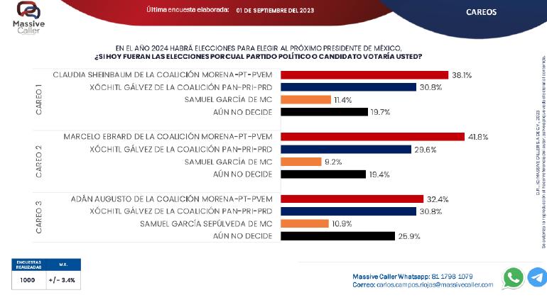 Hizo la encuestadora careos simulando si el candidato de Morena fuera Sheinbaum, si fuera Ebrard y si fuera Adán Augusto López, frente a Xóchitl Gálvez de PAN-PRI-PRD y Samuel García por MC.