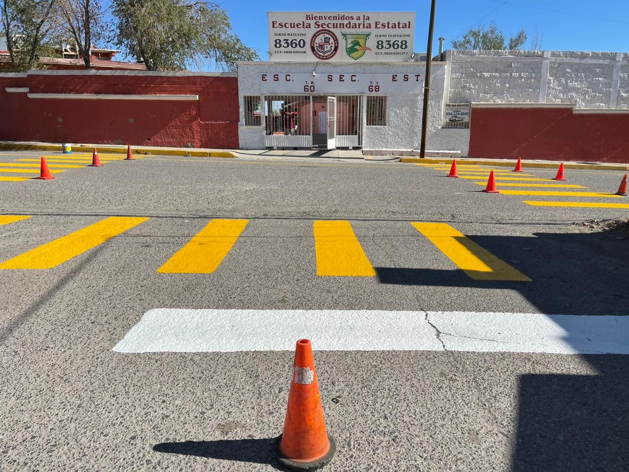 La cuadrilla de Control de Tráfico se encargó de pintar los diferentes cruces del plantel educativo que se ubica entre las calles Álvarez y Álvarez y Toronja Roja, del Infonavit Juárez nuevo, con el fin de destacar las zonas de preferencia para los peatones en el perímetro de la institución.