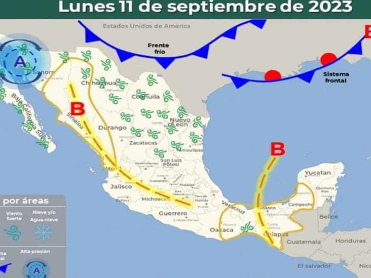 El monzón mexicano, la aproximación de un nuevo frente frío a la frontera norte del país y una línea seca, ocasionarán de chubascos a lluvias puntuales fuertes acompañadas de descargas eléctricas y posible caída de granizo en el noroeste y norte del país, con lluvias puntuales muy fuertes en Sonora, la zona serrana de Chihuahua y Sinaloa.