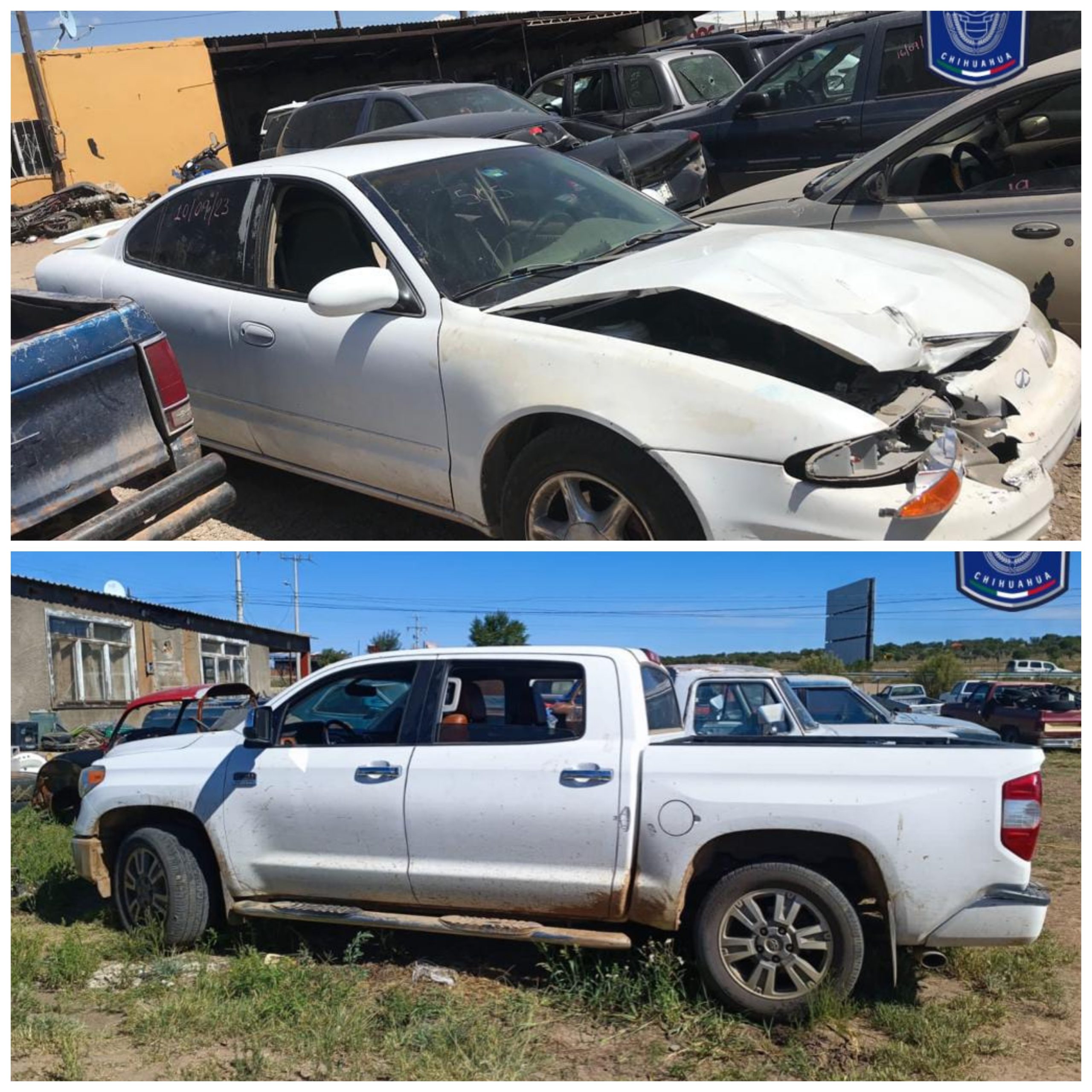 En el depósito ubicado en el kilómetro 116 de la carretera Cuauhtémoc – La Junta, encontraron una pick up de la marca Toyota, línea Tundra Creew, modelo 2016, color blanco, con placas de circulación del estado de Colorado, E. U., cuyo robo se reportó el pasado domingo, en la ciudad de Guerrero. Mientras que en un depósito ubicado en el boulevard Fernando Baeza, de la Ciudad de Cuauhtémoc, encontraron un automóvil de la marca Oldsmobile, línea Alero, modelo 1999, color blanco, sin placas de circulación, con reporte de robo interpuesto el pasado domingo 10 de septiembre, en esa misma localidad.