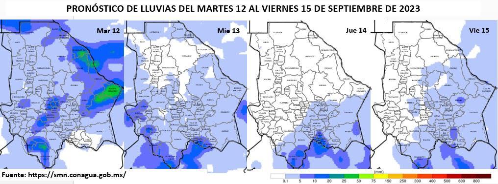 La dependencia informó que las lluvias de fuertes 25.1 a 50 mm en la zona este, incluidos El Oasis y Manuel Benavides; las lluvias de dispersas a moderadas con chubascos de 5.1 a 25 mm se prevén para las zonas norte, oeste, suroeste, centro, sureste y noreste, incluidos Juárez, Guadalupe, Ahumada, Palomas, Ocampo, Guerrero, Guachochi, Nonoava, Morelos, Guadalupe y Calvo, San Francisco de Borja, Cuauhtémoc, Chihuahua, Satevó, Julimes, Saucillo, La Cruz, Coyame y Ojinaga.