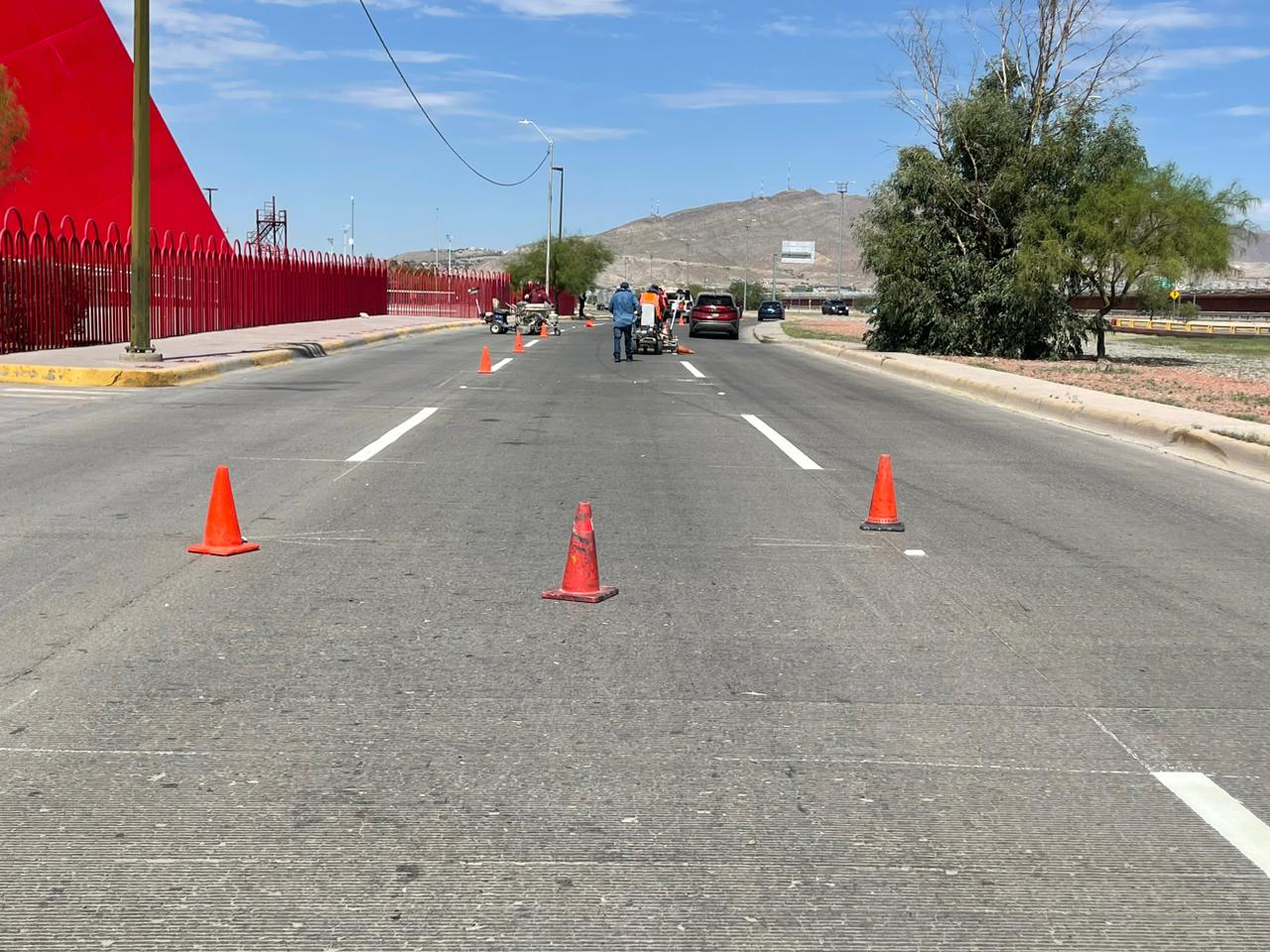 Personal del área de Control de Tráfico de la Coordinación General de Seguridad Vial se encuentra pintando las líneas para la división de carriles vehiculares en la parte posterior de la Plaza de la Mexicanidad, sobre la avenida Rafael Pérez Serna.