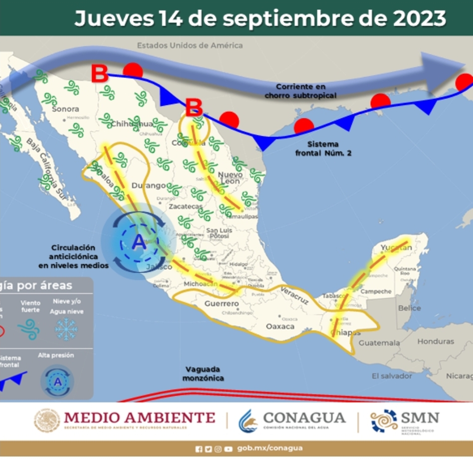 El frente Núm. 2 permanecerá con características de estacionario sobre el norte y noreste del país, a su vez, el monzón mexicano se mantendrá en el noroeste del territorio nacional.