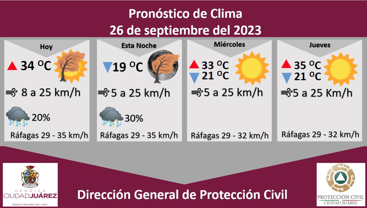 Para hoy se espera una temperatura máxima de 34 °C, mientras que la mínima será de 19 °C por la noche, la velocidad del viento oscilará entre 5 y 25 kilómetros por hora.Para mañana miércoles se esperan ráfagas de viento que alcanzarán los 32 kilómetros por hora, la temperatura máxima será de 33 °C y una mínima de 21 °C, el viento se mantendrá de 5 a 25 kilómetros por hora durante el transcurso del día.