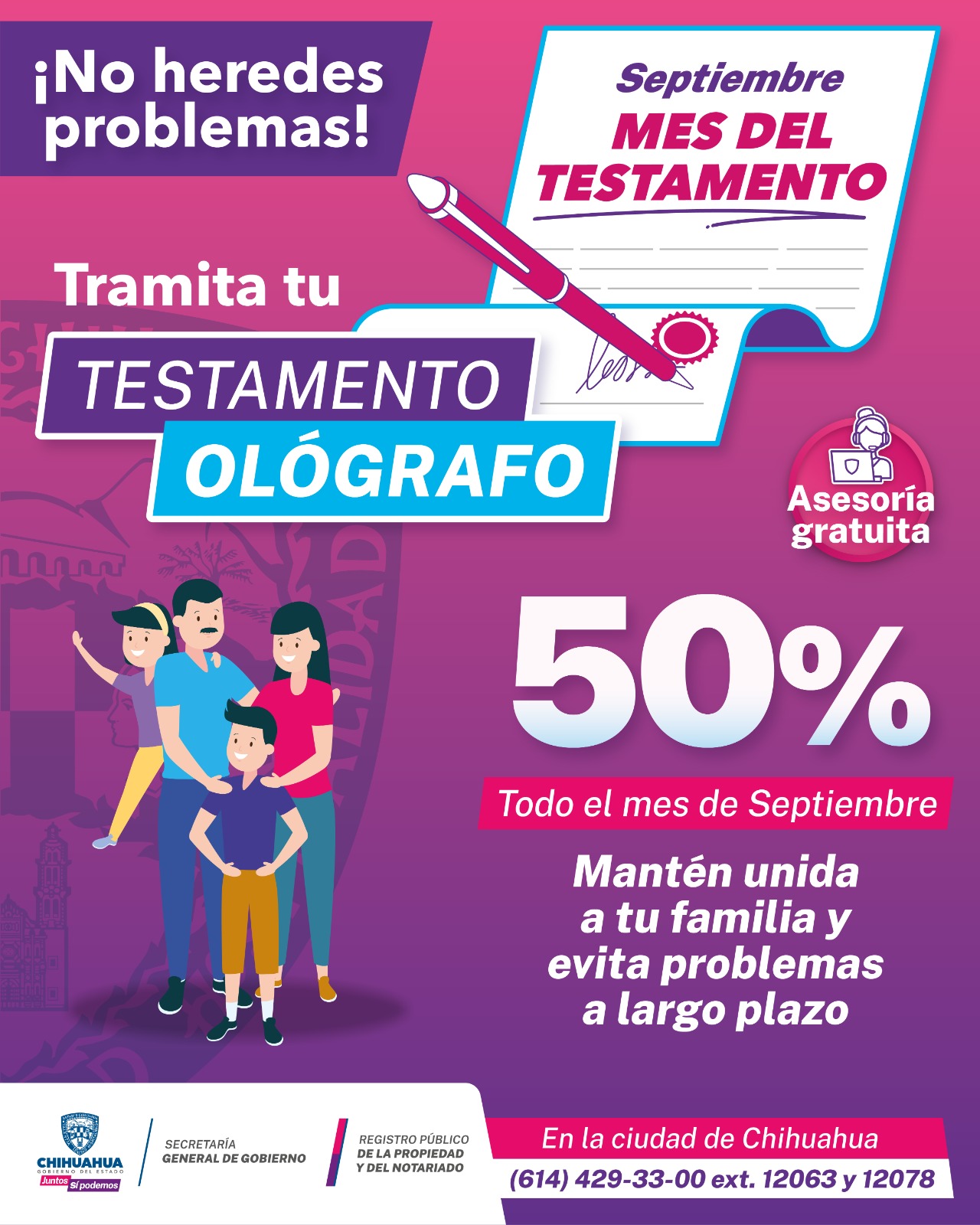 La Secretaría General de Gobierno, a través del Registro Público de la Propiedad, invita a las y los chihuahuenses a aprovechar los últimos días del Mes del Testamento para tramitar este documento ológrafo, o bien, realizar el pago del mismo y agendar la cita para los próximos meses.