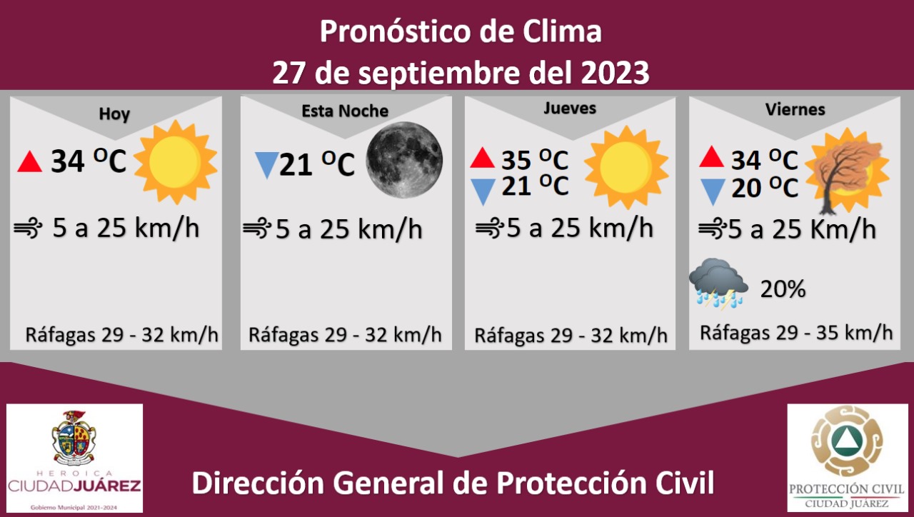 Para hoy se esperan fuertes ráfagas de viento que alcanzarán los 32 kilómetros por hora, la velocidad del viento oscilará entre 5 y 25 kilómetros por hora.Para mañana jueves se esperan ráfagas de viento que alcanzarán los 32 kilómetros por hora, la temperatura máxima será de 35 °C y una mínima de 21 °C, el viento se mantendrá de 5 a 25 kilómetros por hora durante el transcurso del día.