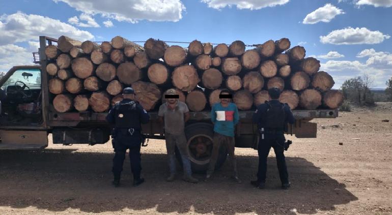 Policías estatales detuvieron a dos personas que transportaban de forma ilegal 58 piezas de madera en rollo, en el municipio de Ignacio Zaragoza, Chihuahua.