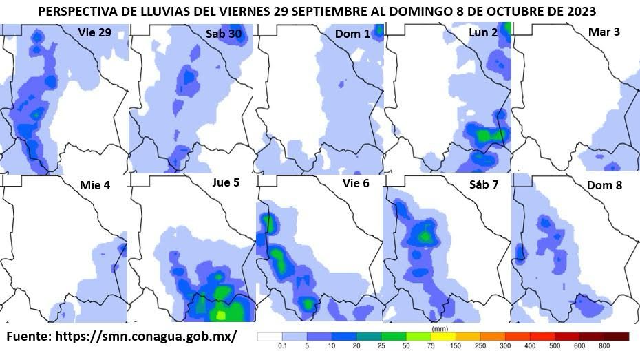 En el acumulado de de lluvias, la dependencia dio a conocer que irán de dispersas a moderadas con chubascos (de 5.1 a 25 mm) en Guadalupe, Ahumada, Sueco, Morelos, Guadalupe y Calvo, Guachochi, Balleza, San Francisco de Borja, Riva Palacio y Chihuahua.