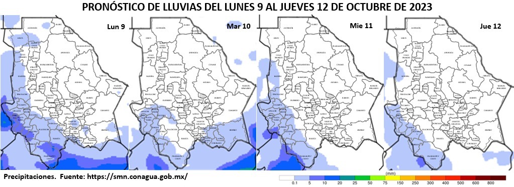A partir del miércoles 11 de octubre se espera una recuperación en el promedio de temperaturas.Las máximas esperadas para esta tarde de lunes son (°C): Chihuahua 27, Juárez 28, Janos 28, Madera 23, Temósachic 25, Cuauhtémoc 23, Ojinaga 30, Delicias 27, Camargo 25, Jiménez 19, Parral 20, Creel 20, Chínipas 35, Guachochi 16, El Vergel 14.