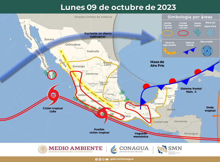 Para este lunes, la masa de aire que impulsó al frente frío número 4, en interacción con la humedad procedente del Océano Pacifico y la abundante humedad procedente de la Tormenta Lidia, la corriente en chorro, inestabilidad en niveles altos de la atmósfera y un canal de baja presión favorecerá ambiente de fresco a templado por la mañana, de cálido a caluroso por la tarde, temperaturas frías en la zona serrana, cielo de despejado a parcialmente nublado, vientos de 2 a 15 km/h, con rachas que pueden superar los 35 km/h en partes de la zona suroeste, incluye Urique.