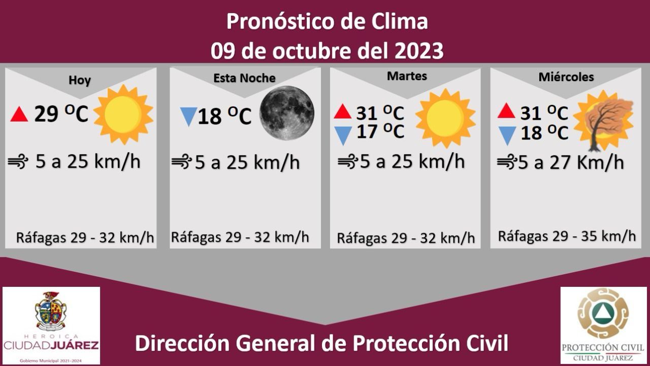 La Dirección General de Protección Civil, con base en informes del Servicio Meteorológico Nacional, pronostica un lunes mayormente soleado con una temperatura máxima de 29 grados Celsius, mientras que la mínima será de 18 °C para esta noche.Roberto Briones Mota, titular de la dependencia, informó que para hoy se esperan fuertes ráfagas de viento que alcanzarán los 32 kilómetros por hora, en tanto que la velocidad del viento durante el día oscilará entre 5 y 25 kilómetros por hora.