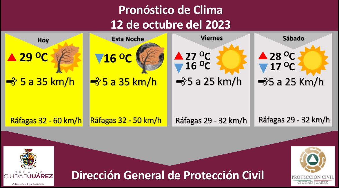 La Dirección General de Protección Civil, con base en informes del Servicio Meteorológico Nacional, emite una alerta amarilla para este jueves debido a fuertes ráfagas de viento, las cuales podrían llegar a los 50 kilómetros por hora, informó Roberto Briones Mota, titular de la dependencia.