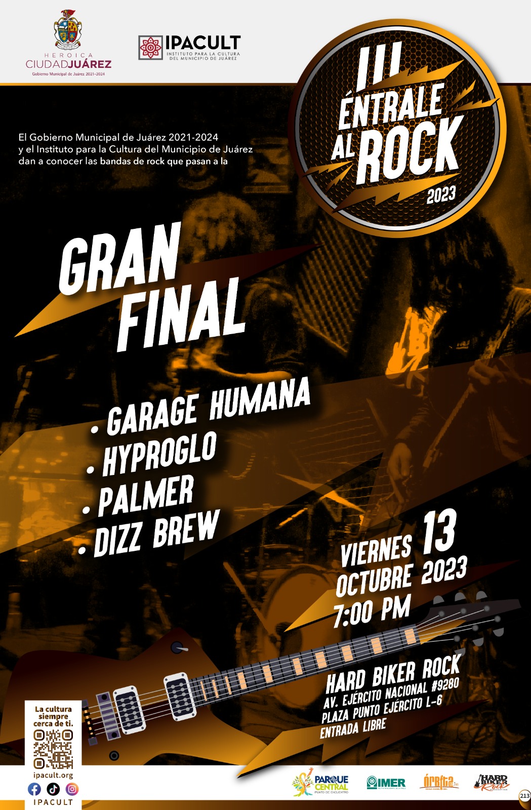 Luego de que el pasado fin de semana se llevaron a cabo las semifinales de la tercera edición del concurso “Éntrale al Rock 2023”, mañana viernes 13 de octubre será la gran final del certamen, a partir de las 7:00 de la tarde en el Hard Biker Rock, dio a conocer Miguel Ángel Mendoza Rangel, director del Instituto para la Cultura del Municipio de Juárez (IPACULT).