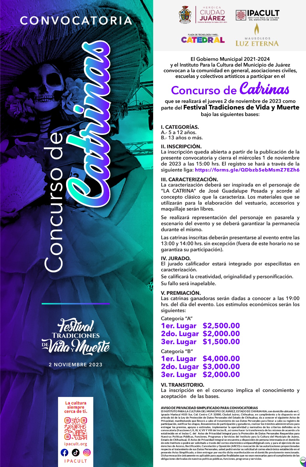 El Gobierno Municipal de Juárez 2021-2024, a través del Instituto para la Cultura del Municipio de Juárez (IPACULT), convoca a la comunidad, asociaciones civiles, escuelas y colectivos artísticos a formar parte del concurso de catrinas, evento que se llevará a cabo el día 02 de noviembre, dentro del “Festival Tradiciones Vida y Muerte”.