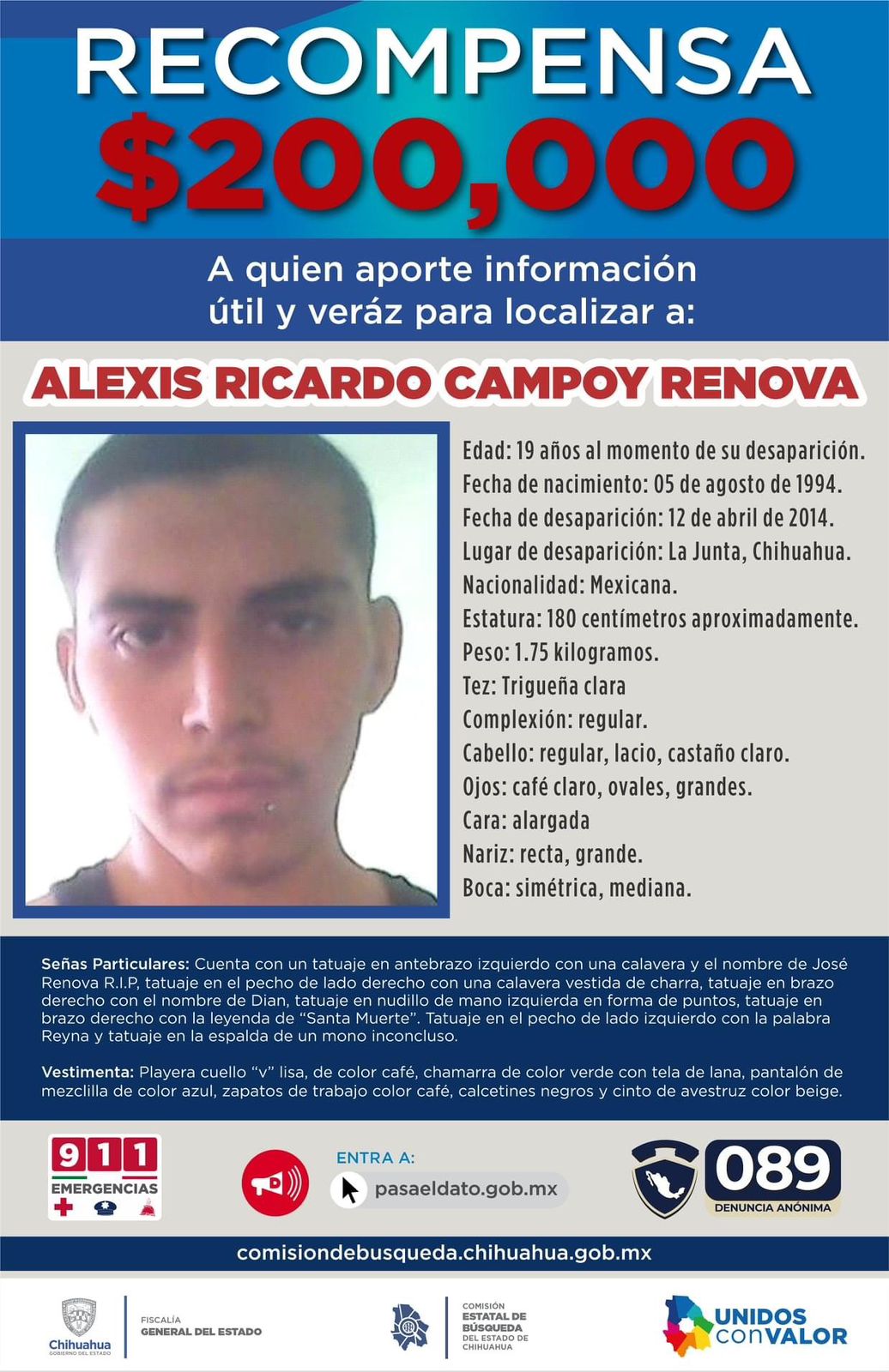Alexis Ricardo cuenta con reporte de desaparición interpuesto el 12 de abril de 2014, en La Junta, municipio de Guerrero, cuando tenía 19 años de edad.