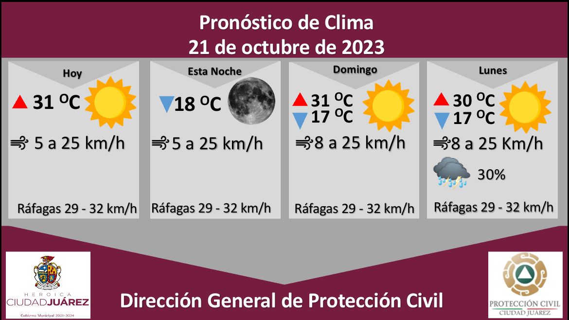 Para mañana domingo se esperan fuertes ráfagas de viento que llegarán los 32 kilómetros por hora, la temperatura máxima se pronostica en los 31 °C, mientras que la mínima será de 17 °C, la velocidad del viento oscilará de 8 a 25 kilómetros por hora.