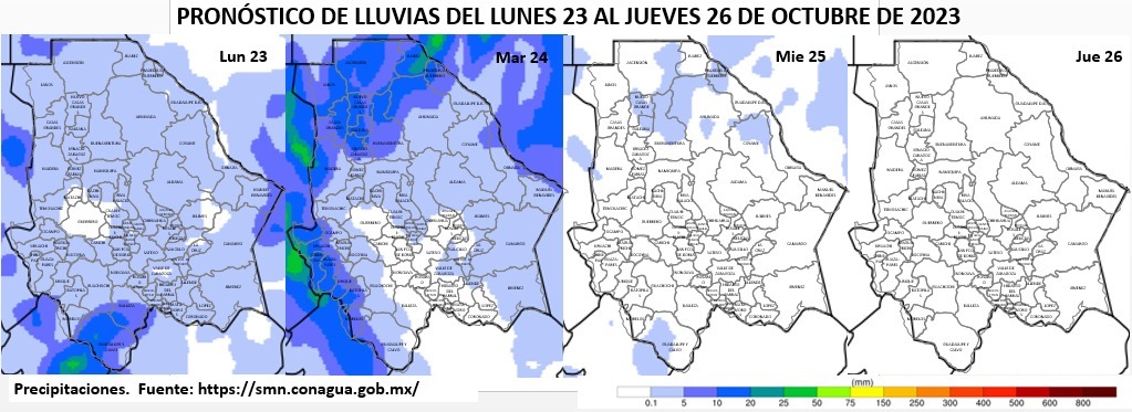 Este lunes 23 de octubre se esperan lluvias de dispersas a moderadas con chubascos (de 5.1 a 25 mm), en municipios como Guadalupe y Calvo, Guachochi, Balleza y Manuel Benavides.Serán de aisladas a dispersas de (de 2.1 a 5 mm) en Juárez, Ahumada, Guadalupe, Ascensión, Janos, Casas Grandes, Nuevo Casas Grandes, Madera, Moris, Ocampo, Uruachi, Chínipas, Guazapares, Urique, Batopilas, Morelos, Santa Isabel, Chihuahua, Aldama, Rosales, Meoqui, Delicias, Saucillo, La Cruz, Camargo, Satevó, Rosario, Parral, Santa Bárbara, Matamoros, Allende, Jiménez, Coyame y Ojinaga.