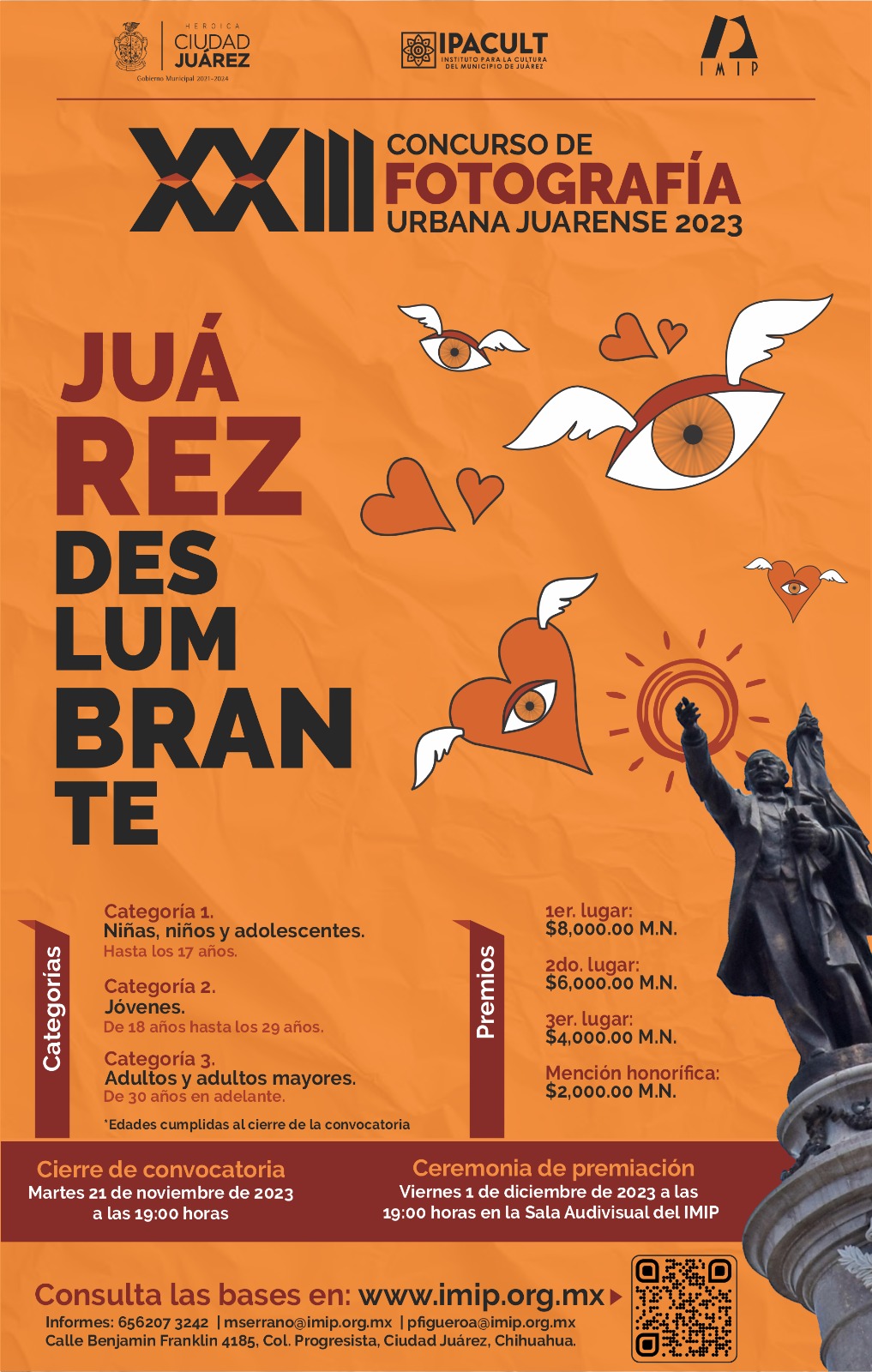 El funcionario comentó que los interesados pueden registrarse y enviar sus fotografías hasta el cierre de la convocatoria el próximo martes 21 de noviembre a las 19:00 horas.Los interesados en participar pueden consultar las bases de la convocatoria en la página www.imip.org.mx, o solicitar más información al número de teléfono 656-207-3242.
