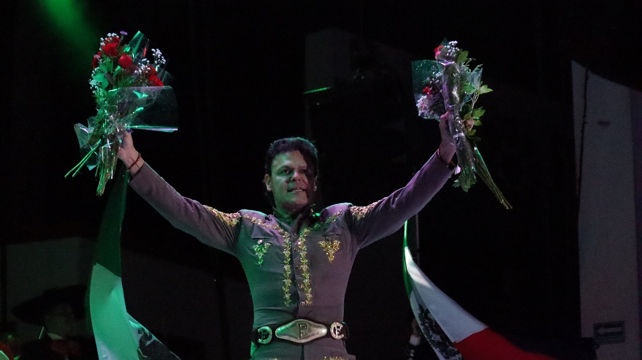 Al ritmo de su famosa “Canción del Mariachi”, el artista mexicano arribó al escenario en punto de las 8:30 de la noche, ataviado con un traje de charro gris y una majestuosa capa roja que lo hicieron adueñarse del recinto desde ese momento, entre los gritos y aplausos de la gente que esperaba ansiosa su presencia.