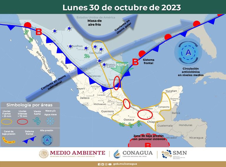 La Coordinación Estatal de Protección Civil dio a conocer que para este lunes 30 de octubre el frente frío número 8 y su masa de aire ártico asociada en la entidad en interacción con humedad procedente del Océano Pacifico y del Golfo de México, la corriente en chorro, inestabilidad en niveles altos de la atmósfera y un canal de baja presión favorecerán un ambiente frío por la mañana, de frío a fresco por la tarde, con temperaturas muy frías en la zona serrana.