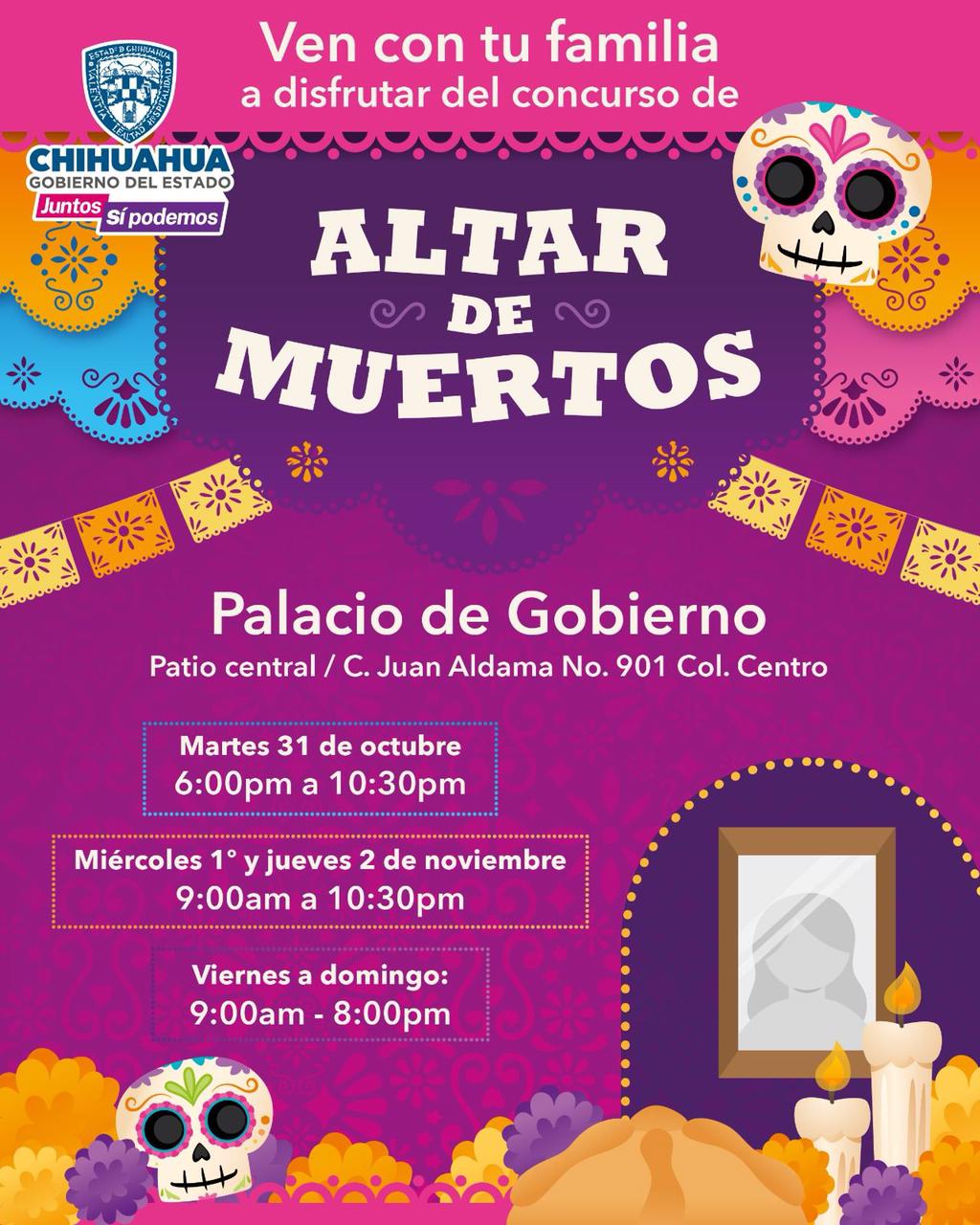 La Coordinación de Relaciones Públicas del Gobierno del Estado, invita a la ciudadanía a visitar la Exposición de Altares de Muertos instalada en el patio central del Palacio de Gobierno, que se inaugura este 31 de octubre a las 18:00 horas y permanecerá hasta el domingo 5 de noviembre, con entrada gratuita al público.