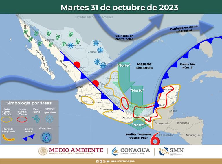 La Coordinación Estatal de Protección Civil dio a conocer que para este martes 31 de octubre el frente frío número 8 y la masa de aire ártico que lo impulsa favorecerá un ambiente de muy frío a frío por la mañana, de frescas a templadas por la tarde, con temperaturas muy frías con heladas en la zona serrana.