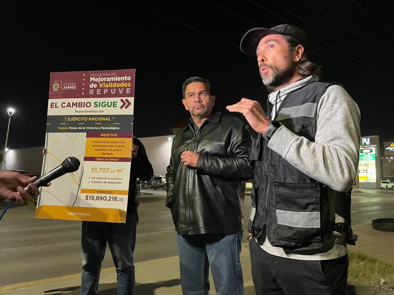 El Presidente Municipal, Cruz Pérez Cuéllar y el director general de Obras Públicas, Daniel González García, supervisaron la noche del jueves los trabajos de repavimentación que lleva a cabo el Municipio en la avenida Ejército Nacional.