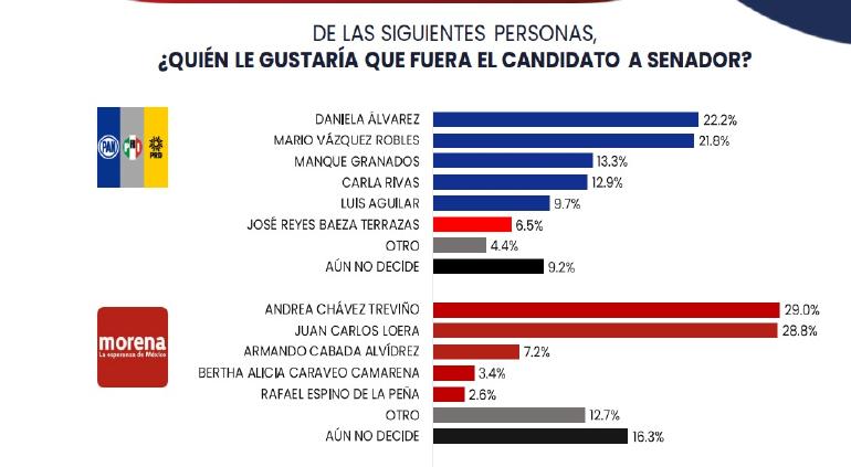 Por parte del PAN, la diputada Daniela Álvarez lidera la encuesta con un 22.2% de las preferencias, seguida de cerca por el diputado local Mario Vázquez, quien cuenta con un 21.8%.
