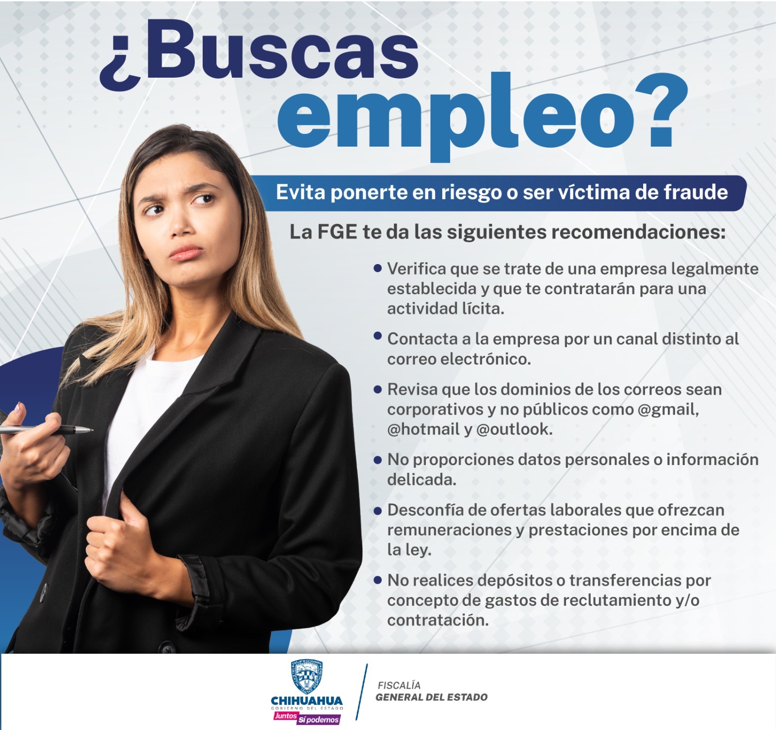Con el objetivo de evitar que las personas que se encuentran buscando empleo se expongan a ser víctimas de un fraude o de otros delitos, la Fiscalía de Distrito Zona Sur emite las siguientes recomendaciones:Verifica que las empresas solicitantes estén legalmente establecidas y que la actividad por la que contratan sea lícita, ya que en ocasiones los delincuentes captan a sus víctimas con falsas ofertas de trabajo y las obligan a realizar actividades ilegales.