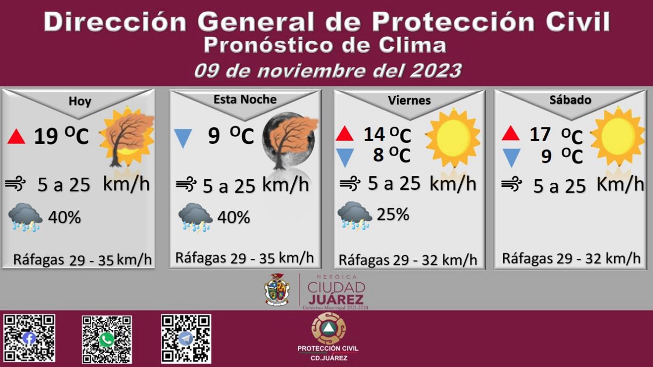 La Dirección General de Protección Civil, con base en informes del Servicio Meteorológico Nacional, pronostica un 40 por ciento de probabilidad de lluvia y tormentas eléctricas para este jueves, informó Roberto Briones Mota, titular de la dependencia. Para hoy se esperan ráfagas de viento que alcanzarán los 35 kilómetros por hora, la temperatura máxima será de 19 °C y la mínima de 9 °C, la velocidad del viento será de 5 a 25 kilómetros por hora.