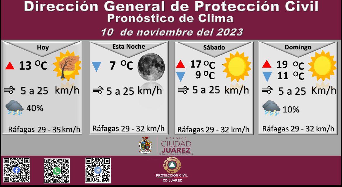 Para mañana sábado se esperan ráfagas de viento que alcanzarán los 32 kilómetros por hora, la temperatura máxima será de 17 °C, mientras que la mínima se pronostica en 9 °C, la velocidad del viento será de 5 a 25 kilómetros por hora.