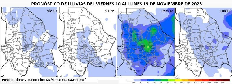 Para el domingo 12 de noviembre, la temperatura máxima en la capital será de 15 °C y la mínima de 10 °C, mientras que se pronostican precipitaciones de moderadas a puntualmente fuertes de 25.1 a 50 milímetros, en partes de las zonas noroeste y centro.