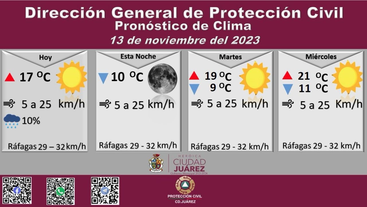 La Dirección General de Protección Civil, con base en informes del Servicio Meteorológico Nacional, pronostica un lunes parcialmente nublado con una temperatura máxima de 17 grados Celsius, mientras que la mínima será de 10 °C para esta noche.Roberto Briones Mota, titular de la dependencia, informó que para hoy se esperan ráfagas de viento que alcanzarán los 32 kilómetros por hora, en tanto que la velocidad del viento durante el día oscilará entre 5 y 25 kilómetros por hora.Para mañana martes las ráfagas de viento serán de 32 kilómetros por hora, la temperatura máxima se pronostica en los 19 °C, mientras que la mínima será de 9 °C, la velocidad del viento oscilará de 5 a 25 kilómetros por hora.El miércoles se esperan vientos de 32 kilómetros por hora, la temperatura máxima se espera en los 21 °C y mínima de 11 °C, la velocidad del viento será de 5 a 25 kilómetros por hora.El Servicio Meteorológico Nacional informa que la masa de aire frío asociada al frente, mantendrá el ambiente vespertino fresco a templado en el noroeste, norte, noreste y centro del territorio nacional.