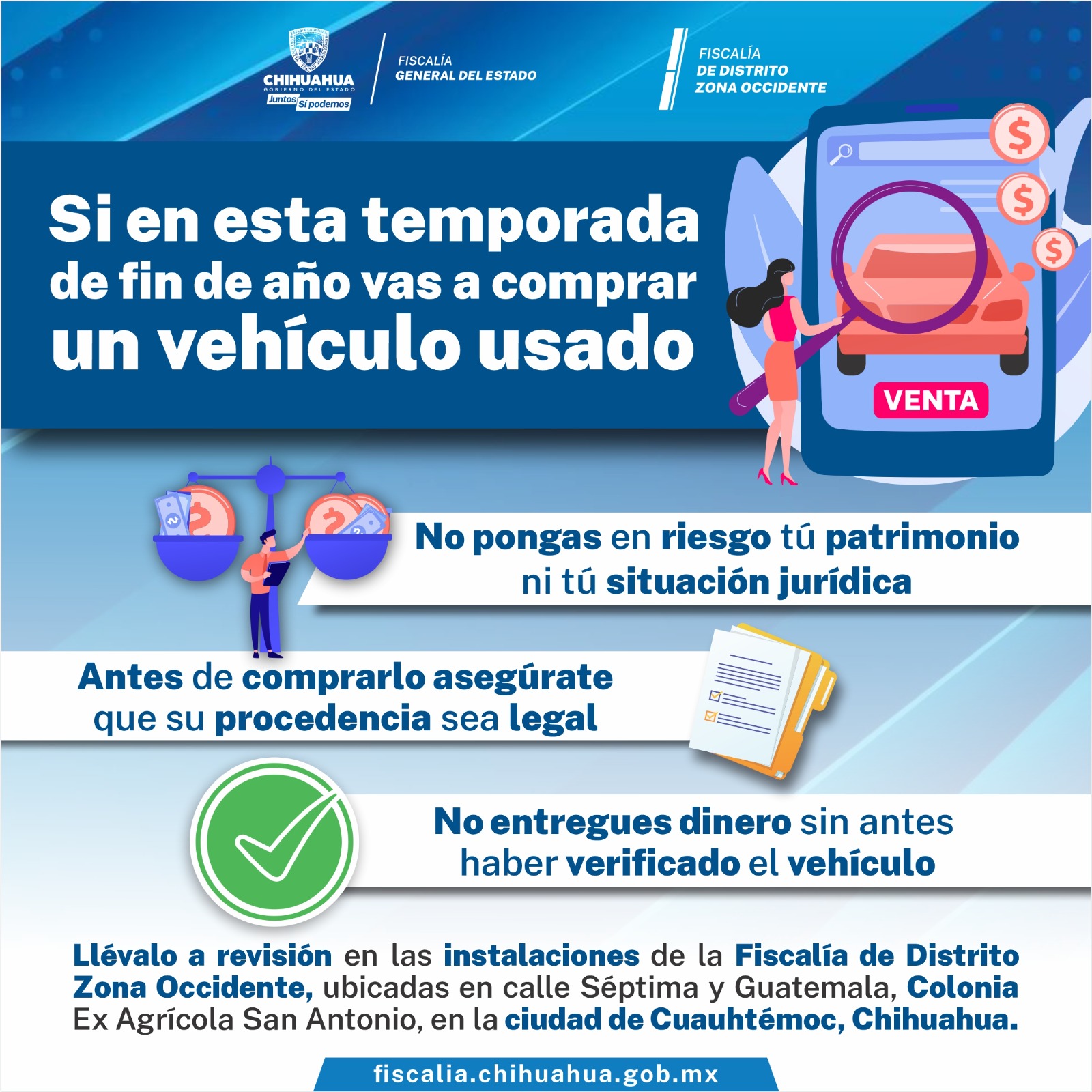 La Fiscalía de Distrito Zona Occidente activó una campaña informativa para alertar a la población y evitar poner en riesgo el patrimonio familiar comprando un vehículo de dudosa procedencia. Esta campaña tiene por objeto orientar a quienes van a vender o comprar un automotor, llevándolo de manera voluntaria a las instalaciones de esta dependencia para que sea revisado de manera gratuita.