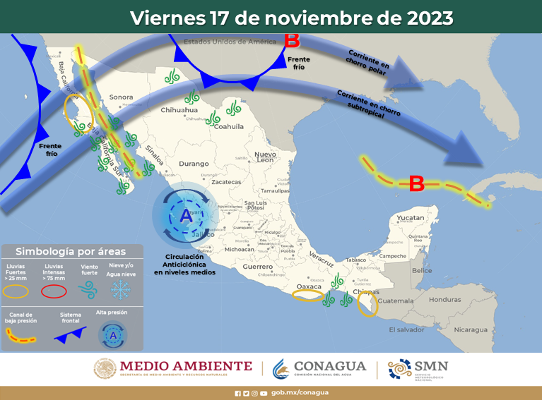 Mesa del Norte: Cielo medio nublado con probabilidad de lluvias aisladas en la zona serrana de Chihuahua. Cielo parcialmente nublado y sin lluvia en el resto de la región. Bancos de niebla al amanecer con ambiente frío y posibles heladas, siendo muy frío en sierras de Chihuahua y Durango. Por la tarde, ambiente templado a fresco. Viento de dirección variable de 10 a 25 km/h, con rachas de 40 a 60 km/h en Chihuahua y Coahuila.