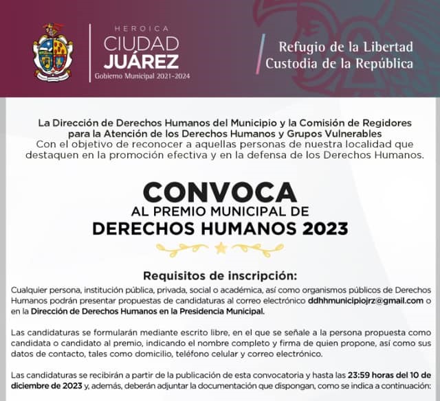 Las candidaturas deben incluir la acreditación de la promoción de los derechos humanos, evidenciando cursos o investigaciones desarrolladas, diseño o participación en programas académicos, entre otros datos relevantes.González Reyes detalló que, en el caso de aquellos cuya participación esté centrada en la defensa de los derechos humanos, se requerirá la comprobación de acciones como asistencia humanitaria, localización de víctimas, asesorías, o atención jurídica, médica o psicológica, entre otras. La convocatoria permanecerá abierta hasta el próximo 10 de diciembre. Para consultar las bases se puede acceder a la página de la Dirección de Derechos Humanos del Municipio de Juárez en la red social Facebook.