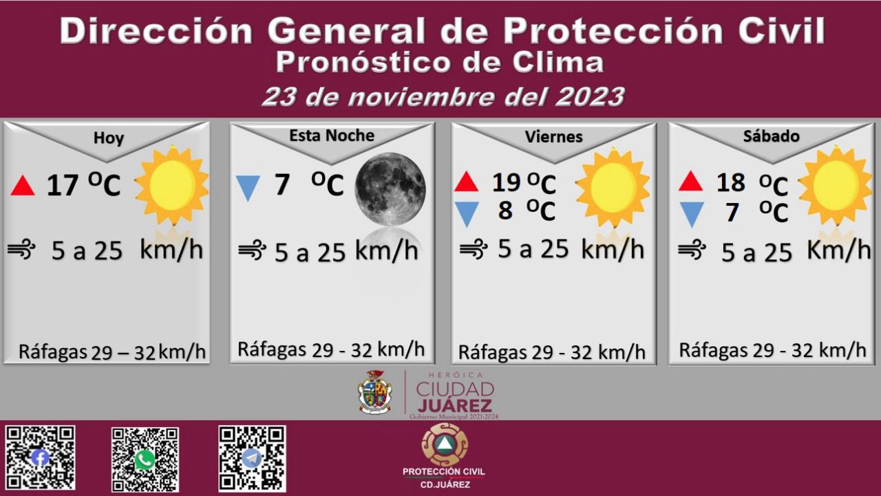 Roberto Briones Mota, titular de la dependencia, informó que para hoy se esperan ráfagas de viento que alcanzarán los 32 kilómetros por hora, en tanto que la velocidad del viento durante el día oscilará entre 5 y 25 kilómetros por hora.