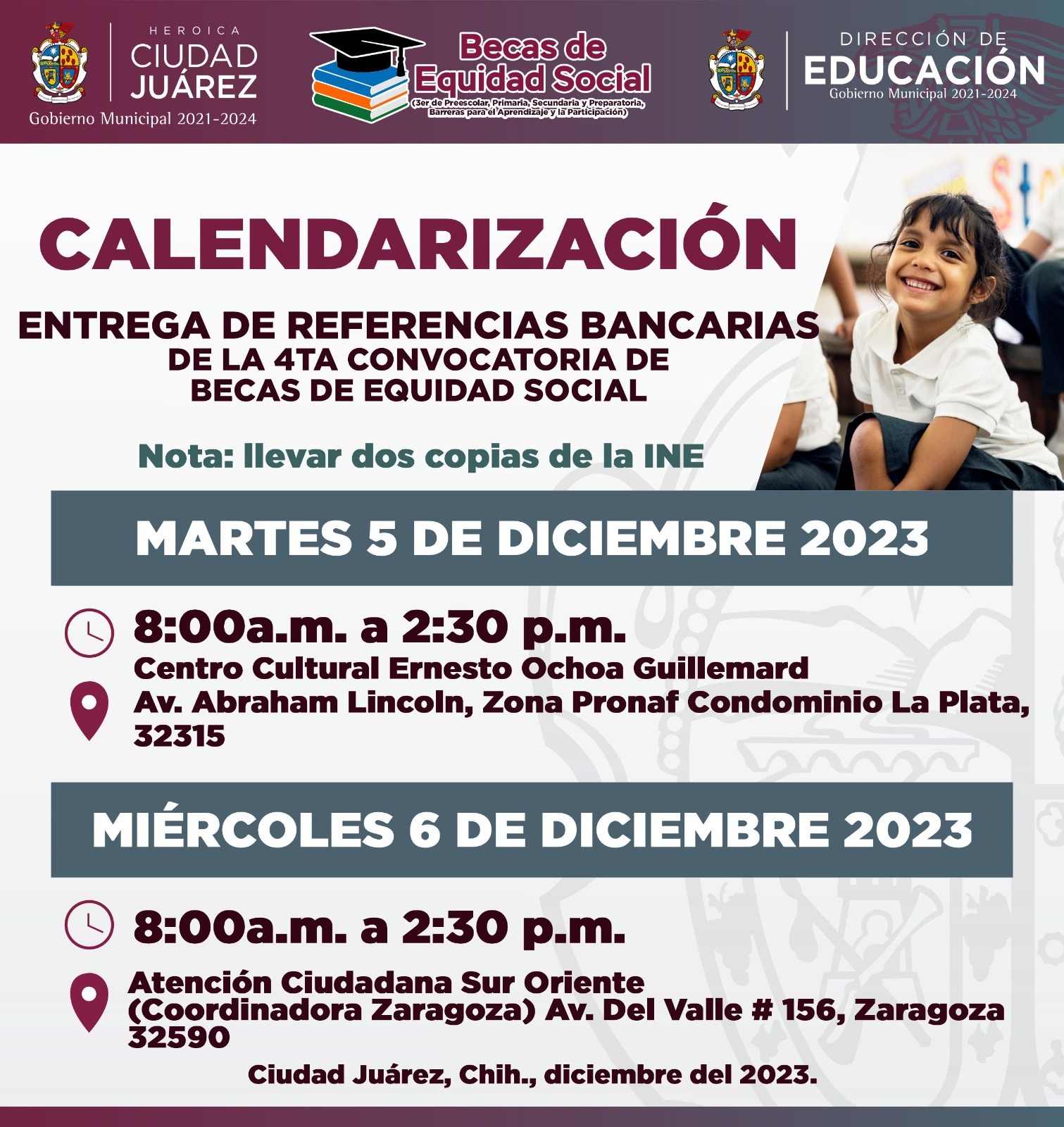 El Gobierno Municipal, a través de la Dirección de Educación, llevará a cabo la cuarta y última entrega del año de becas de equidad social que fueron aprobadas.Las entregas se harán el 5 de diciembre en el Centro Cultural “Ernesto Ochoa Guillemard”, ubicado en la avenida Abraham Lincoln, en la zona Pronaf, así como el 6 de diciembre en la Coordinación de Atención Ciudadana Suroriente, en Zaragoza.La titular de Educación, Martha Aracely González Holguín, informó que ambas entregas serán en horario de 8:00 de la mañana a 2:30 de la tarde y es necesario que acuda la persona responsable de la beca a la sede que le indica la plataforma https://www.juarez.gob.mx/educacion-becasEste mismo link permite saber si la beca fue aprobada o no, solo es necesario ingresar y teclear el número de folio y la Clave Única del Registro de Población (CURP) del alumno.Las personas deben acudir con dos copias de la credencial de elector y una pluma.Estos apoyos están dirigidos a estudiantes de tercero de preescolar, primaria, secundaria y preparatoria, así como a estudiantes con alguna discapacidad o con barreras para el aprendizaje y la participación.Las becas escolares se entregan con el propósito de que los alumnos continúen sus estudios.
