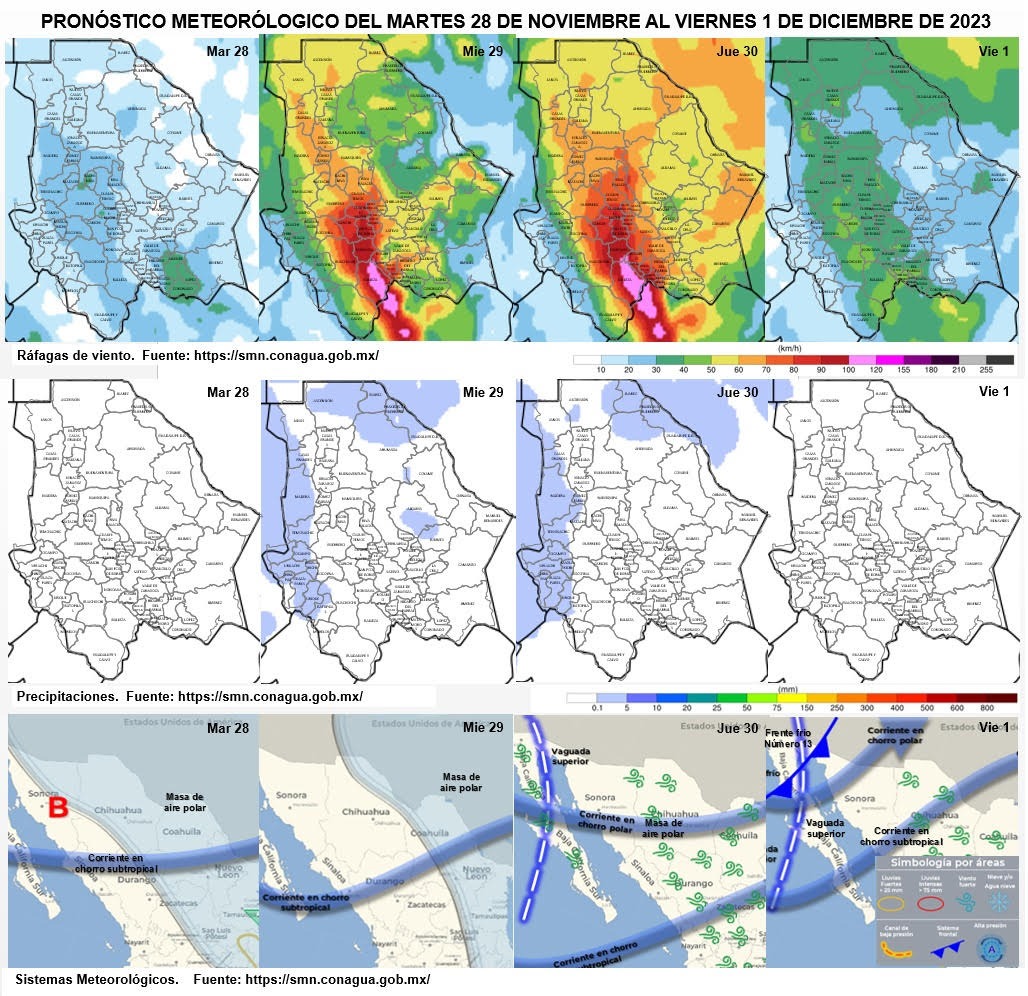 También pueden sobrepasar los 55 km/h en Juárez, Ahumada, Ascensión, Janos, Casas Grandes, Nuevo Casas Grandes, Galeana, Temósachic, Chihuahua, Rosario, Rosales, Delicias, Meoqui, Julimes, Saucillo, San Francisco del Oro, Allende, López, Jiménez y Ojinaga, y superar los 45/km/h en Guadalupe, Buenaventura, Ocampo, Urique, Batopilas, Matamoros, Coronado, Camargo, Camargo y El Oasis.Estas condiciones pueden ocasionar tolvaneras en los tramos carreteros de Juárez a Ascensión y de Chihuahua a La Junta, así como en partes de Carichí, San Francisco de Borja, Guachochi y Balleza, por lo que se exhorta a la población a tomar las debidas precauciones.
