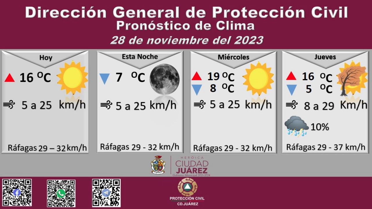 La Dirección General de Protección Civil, con base en informes del Servicio Meteorológico Nacional, pronostica un martes mayormente soleado con una temperatura máxima de 16 grados Celsius, mientras que la mínima será de 7 °C para esta noche. Roberto Briones Mota, titular de la dependencia, informó que para hoy se esperan ráfagas de viento que alcanzarán los 32 kilómetros por hora, en tanto que la velocidad del viento durante el día oscilará entre 5 y 25 kilómetros por hora.