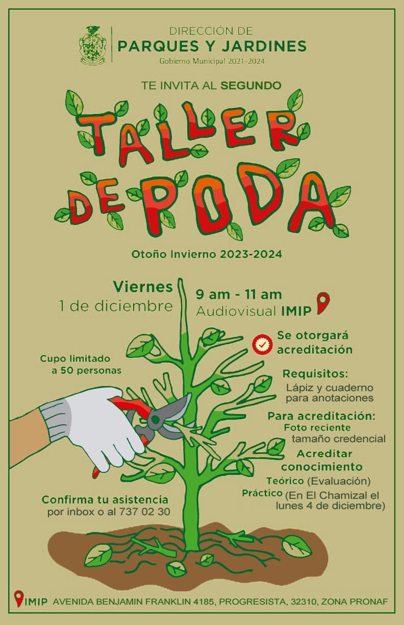 La Dirección de Parques y Jardines invita a la ciudadanía al segundo taller de poda que se impartirá mañana viernes primero de diciembre de 9:00 a 11:00 de la mañana en la sala audiovisual del Instituto Municipal de Investigación y Planeación.