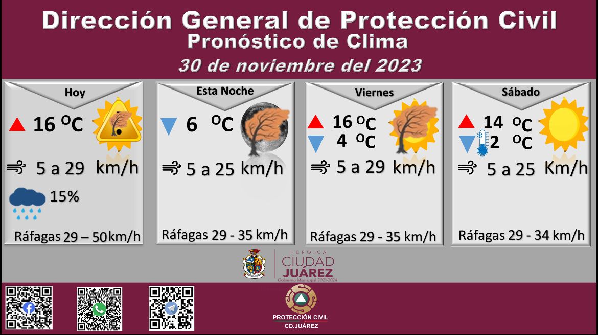 La Dirección General de Protección Civil, con base en el Servicio Meteorológico Nacional, pronostica un 15 por ciento de probabilidad de lluvia para este jueves, con una temperatura máxima de 16 grados Celsius, mientras que la mínima será de 6 °C para esta noche. Roberto Briones Mota, titular de la dependencia, informó que para hoy se esperan fuertes ráfagas de viento que alcanzarán los 50 kilómetros por hora, en tanto que la velocidad del viento durante el día oscilará entre 5 y 29 kilómetros por hora.