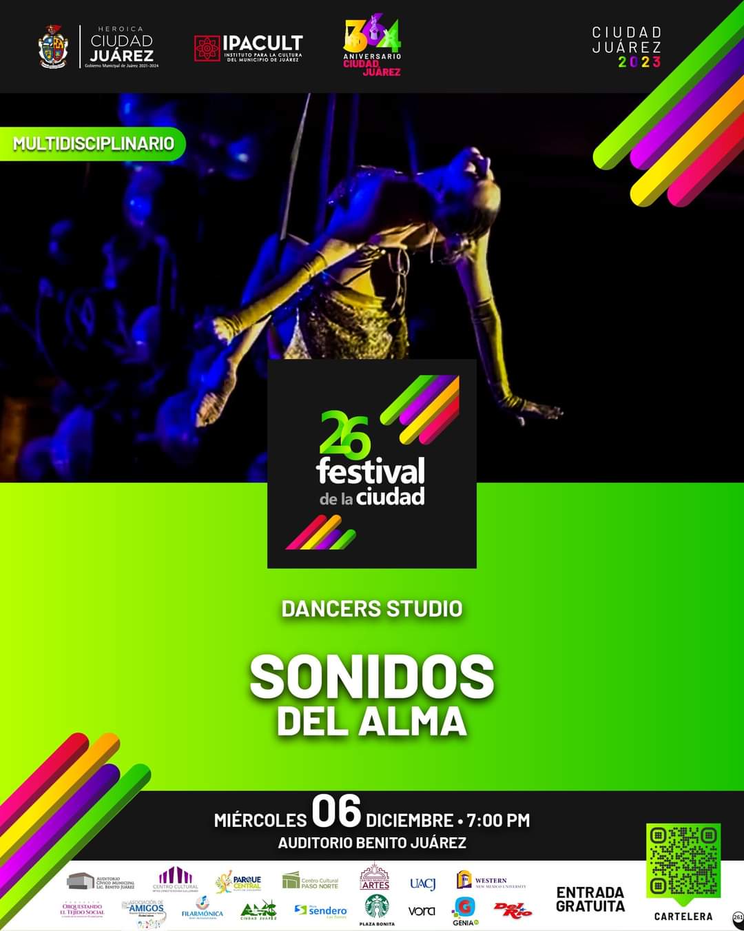 El Instituto para la Cultura del Municipio de Juárez (IPACULT), invita a la comunidad fronteriza a participar de todas las actividades pensadas de manera muy especial, para conmemorar el 364 aniversario de la fundación de la ciudad.Para hoy miércoles 6 a las 7:00 de la tarde, llega la actuación del grupo de danza Dancers Studio, con el espectáculo denominado: Sonidos del alma, teniendo como escenario el Auditorio Benito Juárez, ubicado en la calle Ignacio Ramírez número 311, en la colonia Partido Romero.Mañana jueves, en el mismo recinto cultural también a las 7:00 de la tarde, se contará con la actuación de la cantante Zaira Soria, quien estará deleitando a la comunidad con la interpretación de una gala de ópera mexicana, que lleva por nombre Entre el amor y la bohemia.Miguel Ángel Mendoza Rangel, director del IPACULT mencionó que además de las múltiples presentaciones dentro de este magno evento, se llevará a cabo por segundo año consecutivo el Gran Desfile Conmemorativo de la Ciudad, que este 2023 tendrá como invitado al estado de Oaxaca.Para conocer la información completa del festival, visita las redes sociales del instituto en Facebook, Instagram y TikTok, y también el sitio www.ipacult.org o vía WhatsApp siguiendo la liga https://whatsapp.com/channel/0029VaAN4038KMqjR3mXvz2E