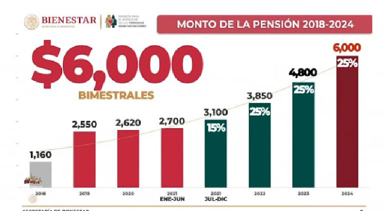 La noticia más destacada del anuncio es el aumento proyectado para el año 2024. Ariadna Montiel Reyes, secretaria de Bienestar informó que la pensión para adultos mayores experimentará un incremento del 25%, lo que elevará el monto bimensual a 6 mil pesos.